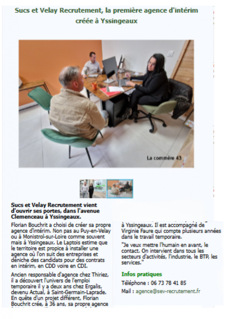 Sucs et Velay Recrutement : La première agence d'intérim créée à Yssingeaux